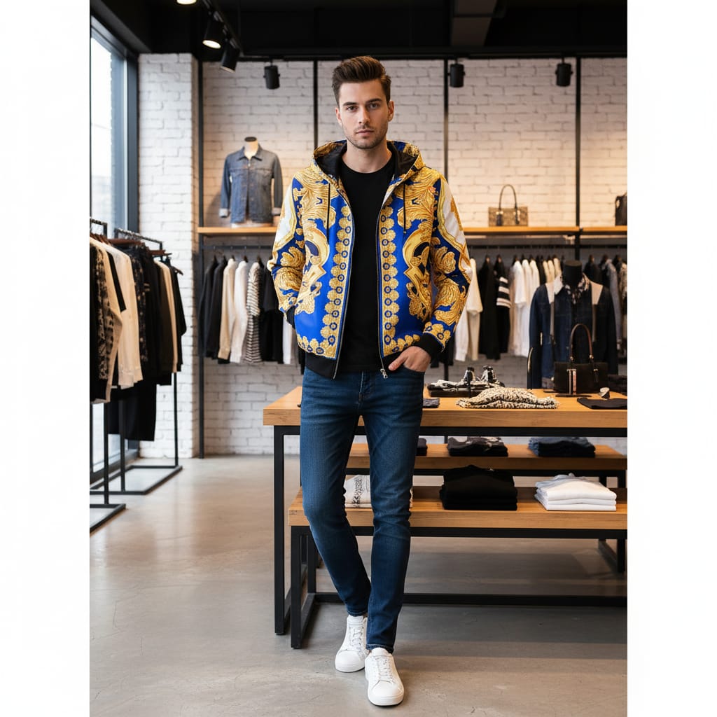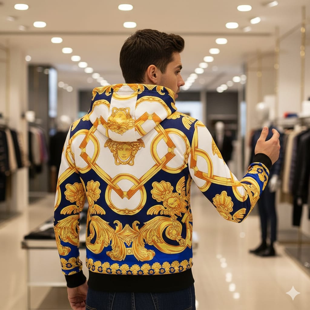 Make a bold statement with this luxurious baroque print hoodie, featuring intricate gold patterns against a deep royal blue and white background. Designed for those who appreciate opulent detail and standout style, this zip-up hoodie combines comfort with high-end fashion flair. The soft, breathable fabric ensures everyday wearability, while the detailed print delivers an unmistakable premium look.