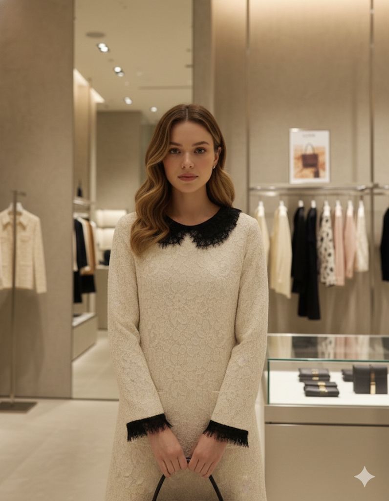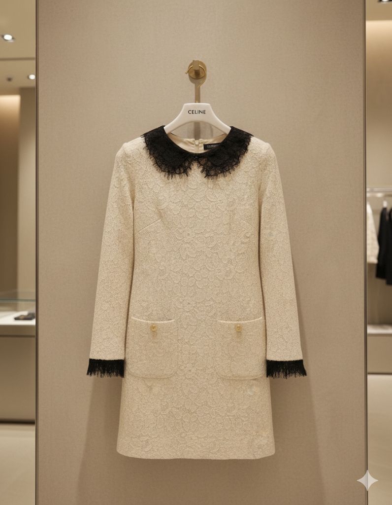 Trapeze Mini Dress With Frilled Collar in Floral Guipure