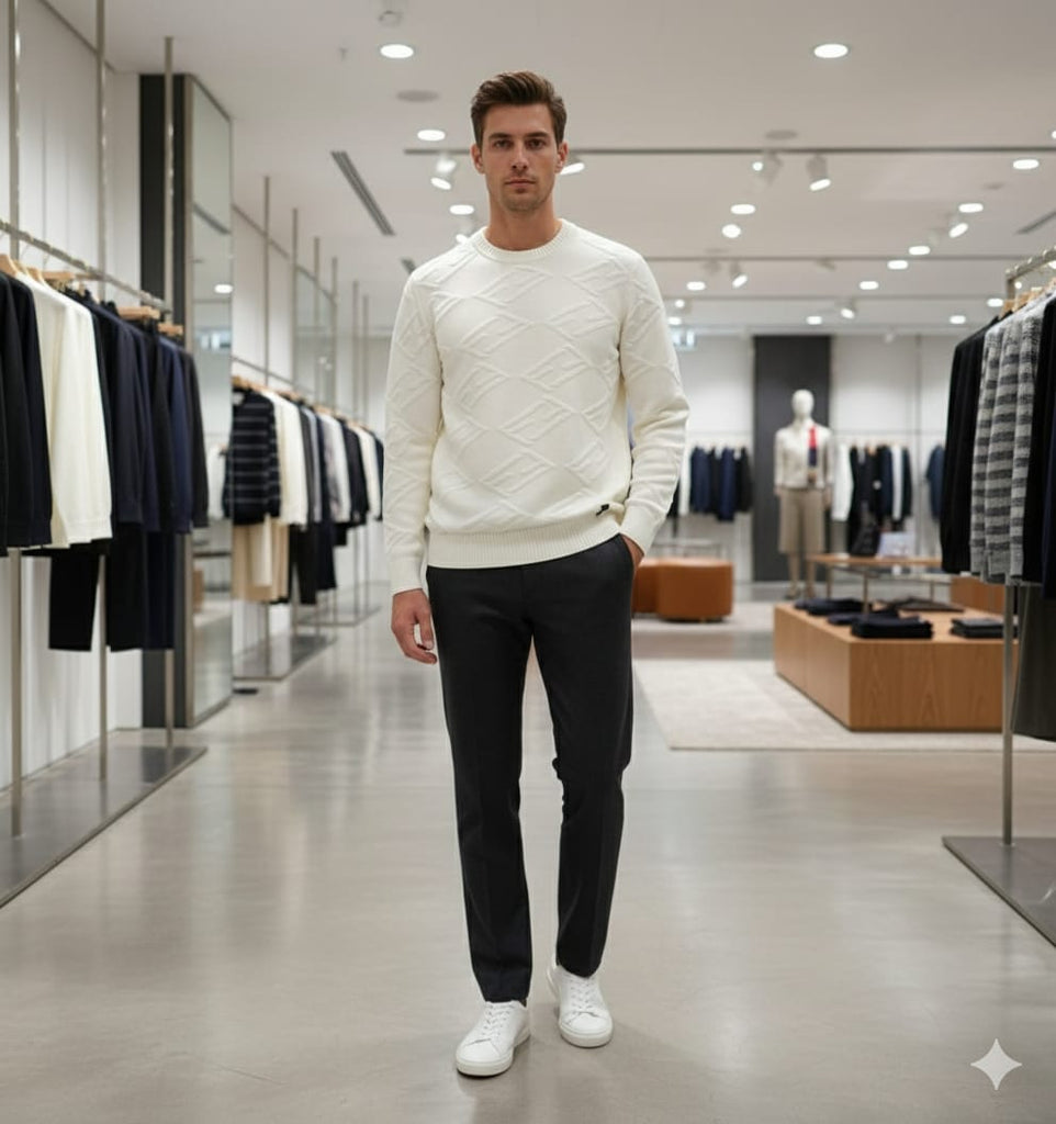 - Unique embossed geometric pattern across the entire sweater, adding dimension and visual interest.