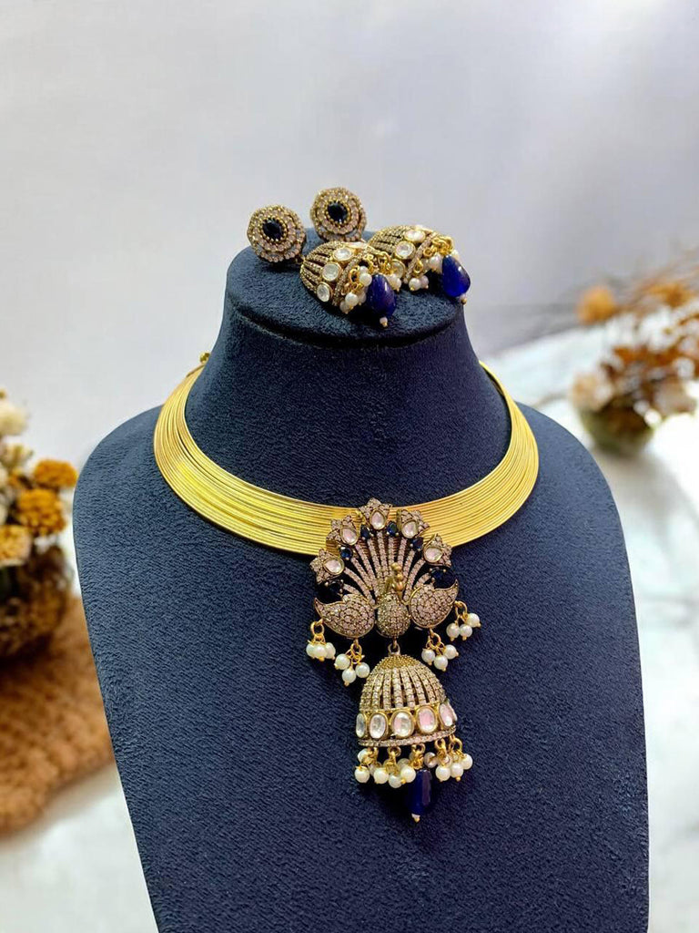 - Embellished with shimmering white stones, kundan work, and navy blue teardrop beads for a touch of elegance.