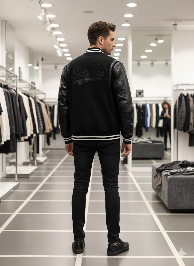 - Striped ribbed collar, cuffs, and hem for a sporty finish.