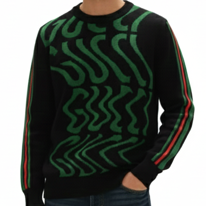 Designer-Style Black Knitted Sweatshirt with Bold Pattern