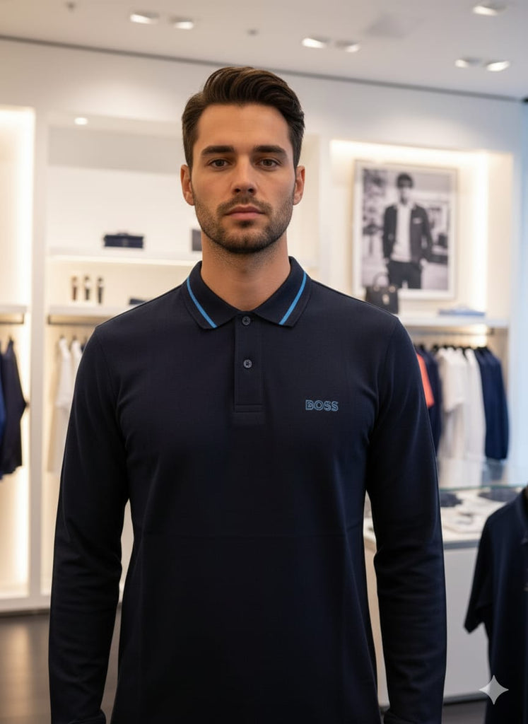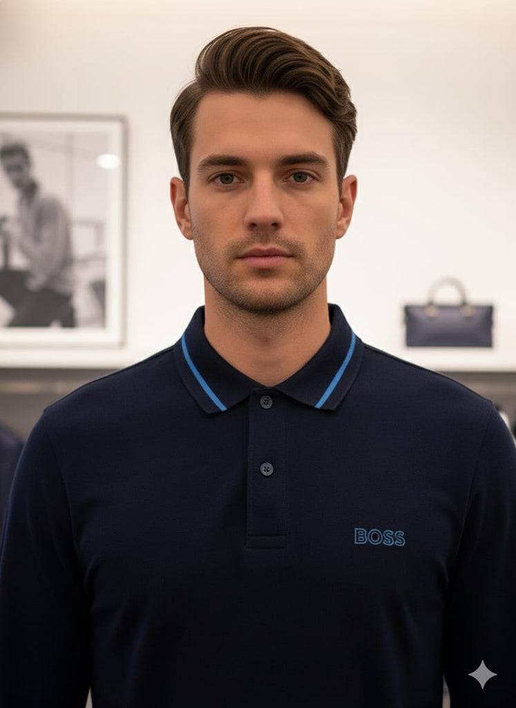 - Contrast-tipped collar in navy, adding a crisp, tailored edge