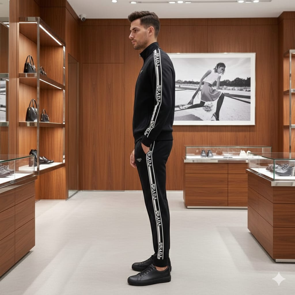 Stylish black track suit with a clean and sporty look.