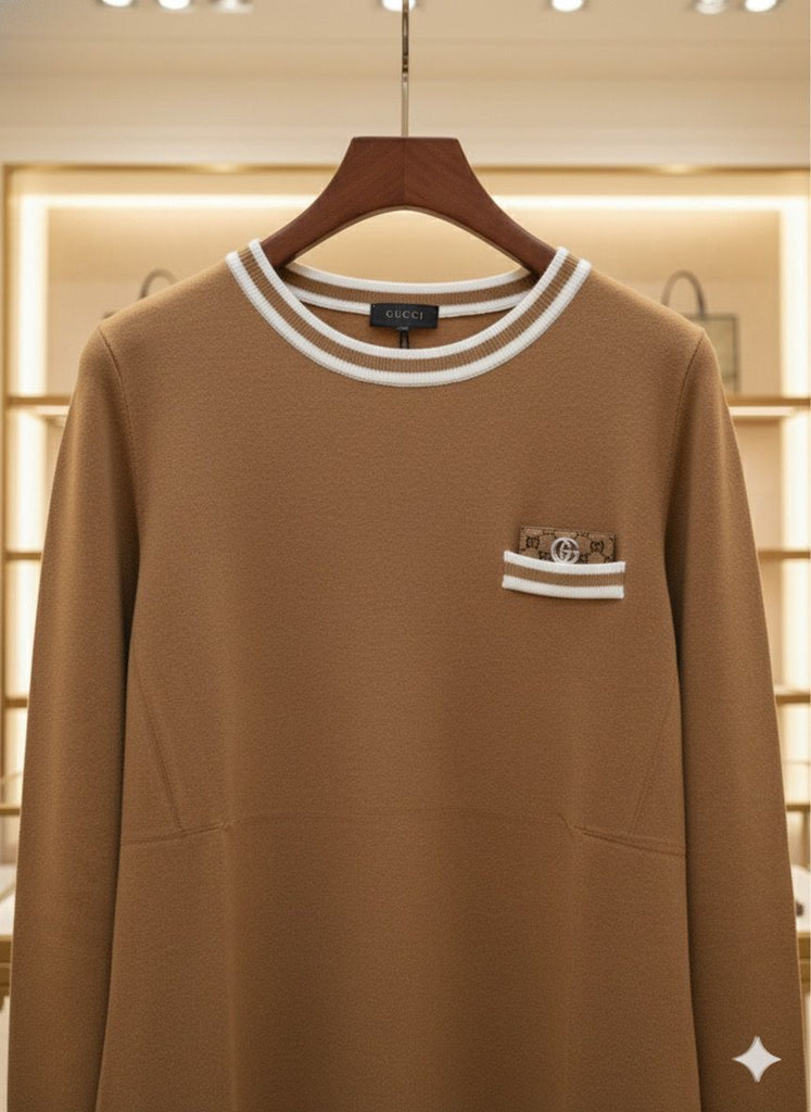 Premium Knitted Beige Dress with Gold Accent Pocket for Women