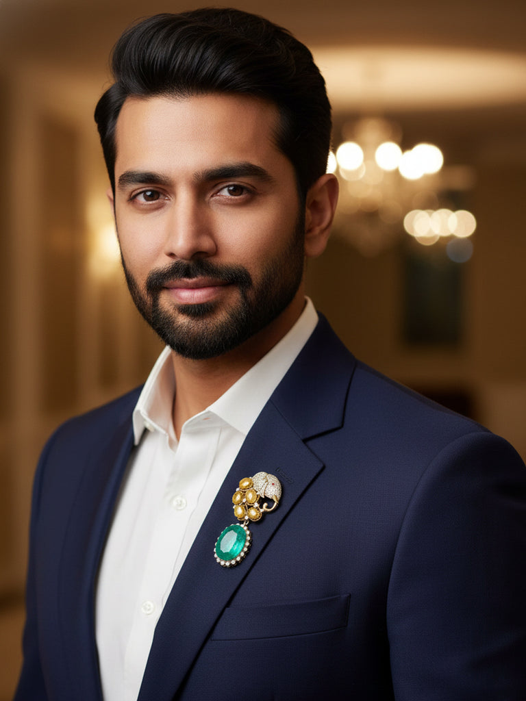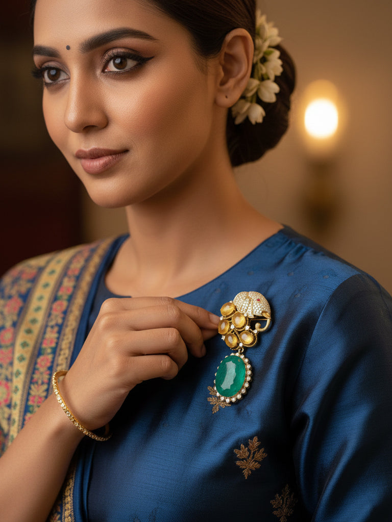 “Victorian Polish Elephant Brooch with Green Doublet and Moissanite Polki”