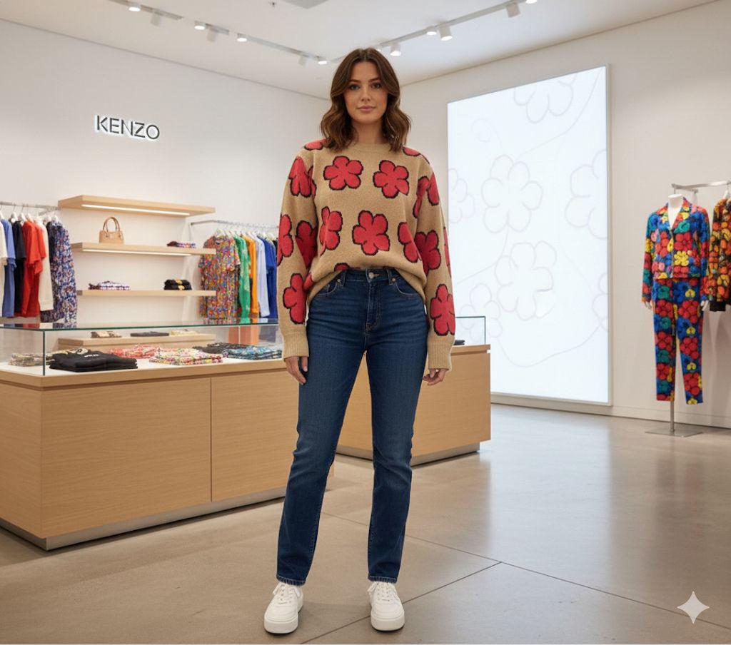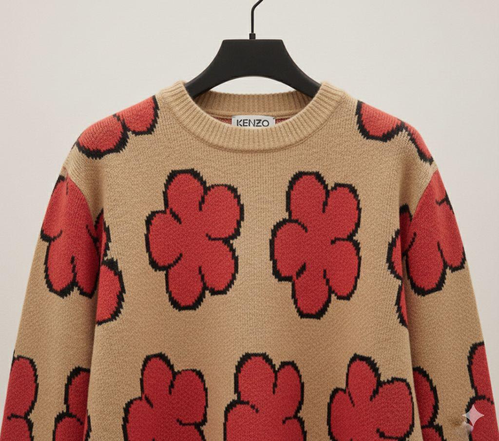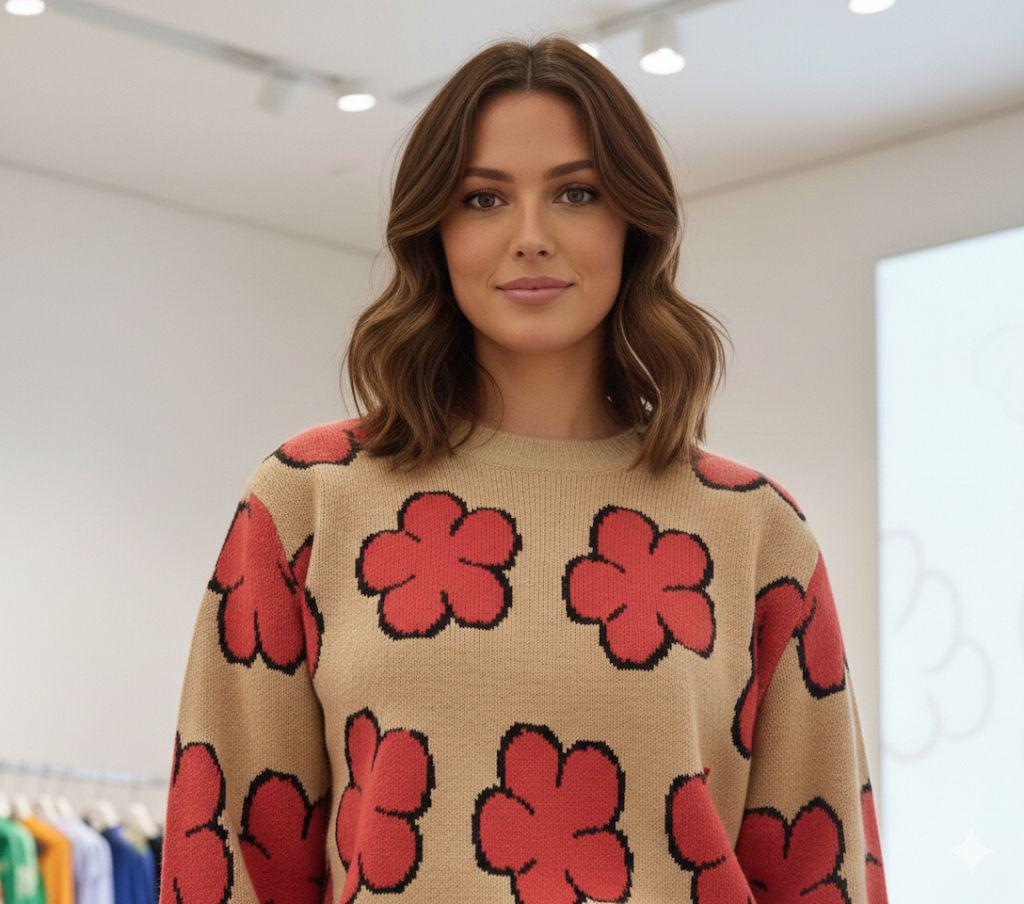 Beige Floral Knit Sweater with Bold Red Flower Print