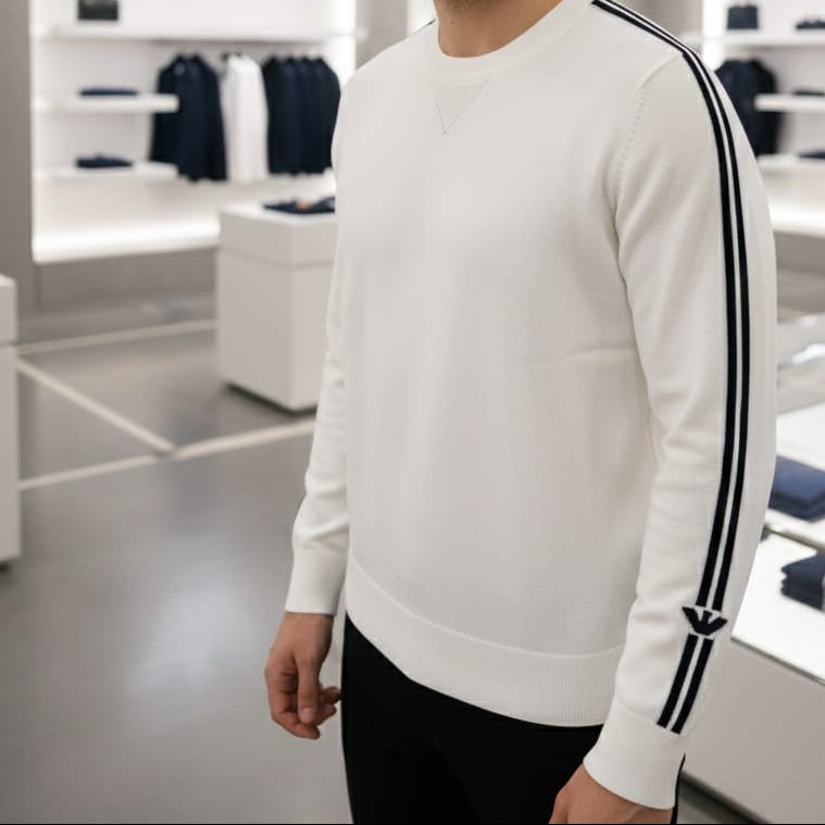 Classic white color with stylish black sleeve stripes