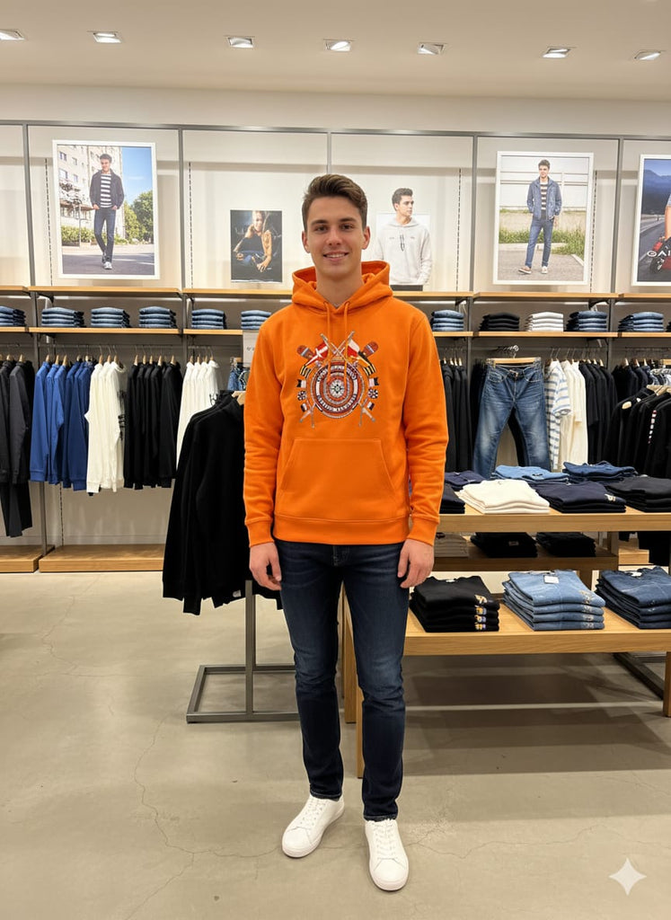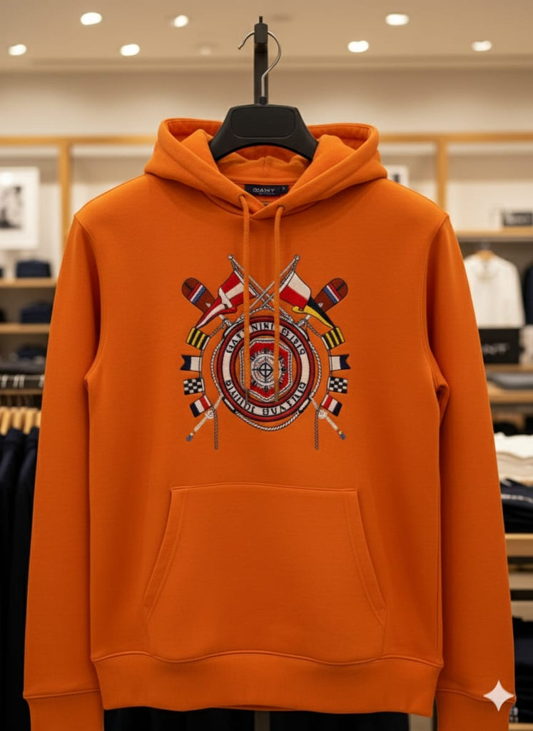 Men’s Orange Printed Hoodie Sweatshirt Stylish Winter Wear with Front Pocket