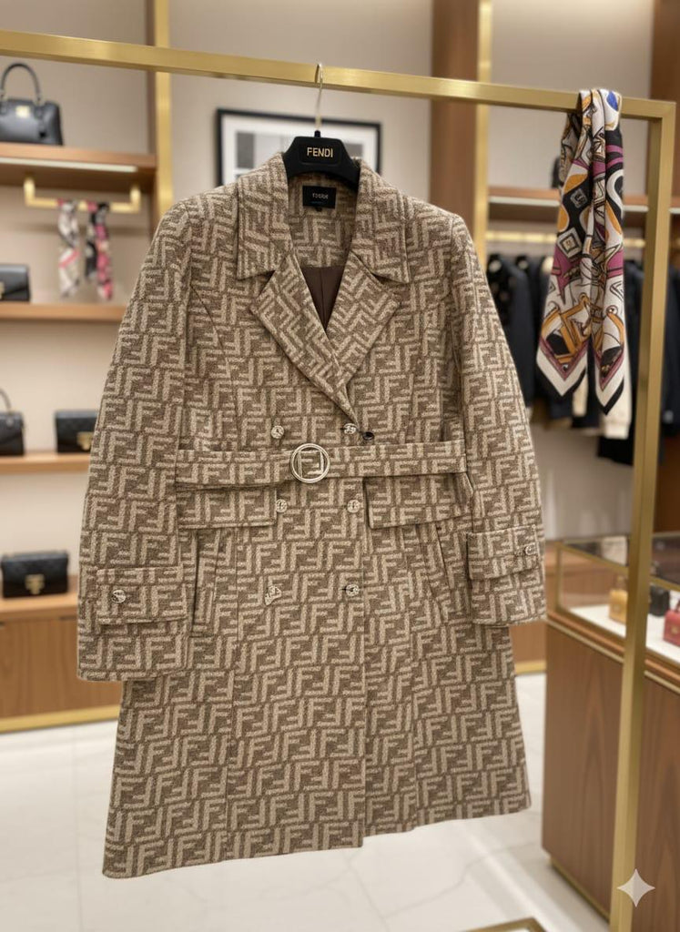 • Stylish brown  trench coat with an all-over monogram pattern.