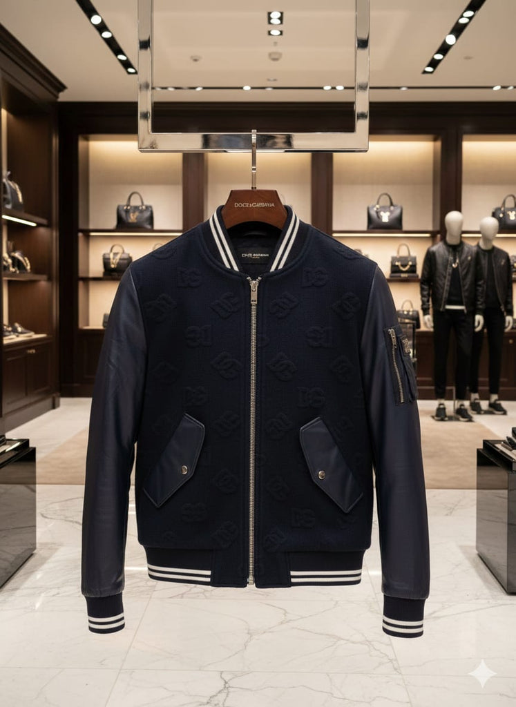 Premium Navy Blue Bomber Jacket with Leather Sleeves