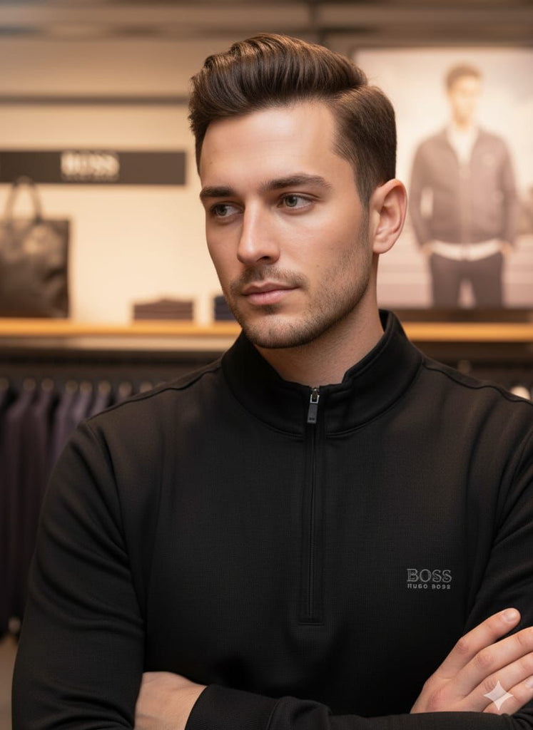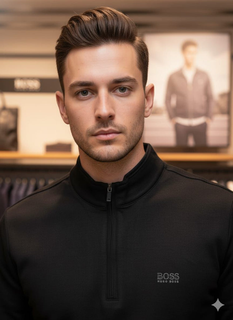 Stand-up collar with a short zipper (quarter-zip) for easy on and off, and adjustable ventilation.