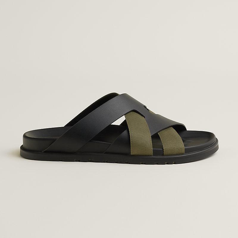 - Olive green canvas and matte black leather straps in a crisscross silhouette for a bold, modern look