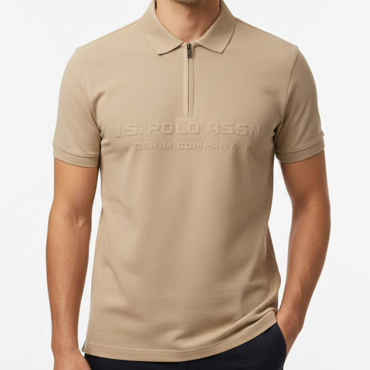 Men’s Beige Zip-Neck Polo T-Shirt with Embossed Logo Design