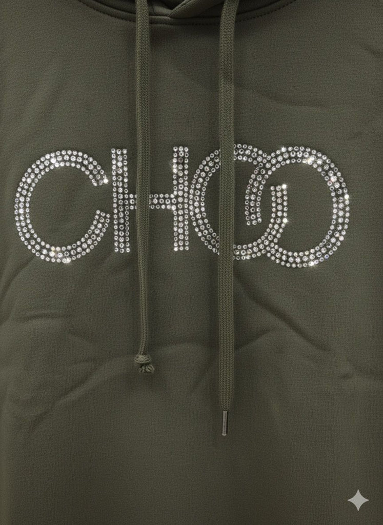 - The hoodie features a shimmering embellished brand logo design, paired with a matching crystal “J” on the joggers. The subtle sparkle gives the set a refined, fashion-forward attitude.