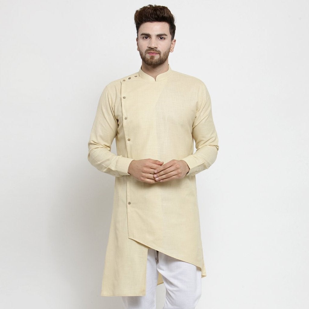 Beige Fornt Cut kurta has a Mandarin collar Neck , long sleeves, rich linen blend,You Can Wear For Everyday Or Special Occasions.