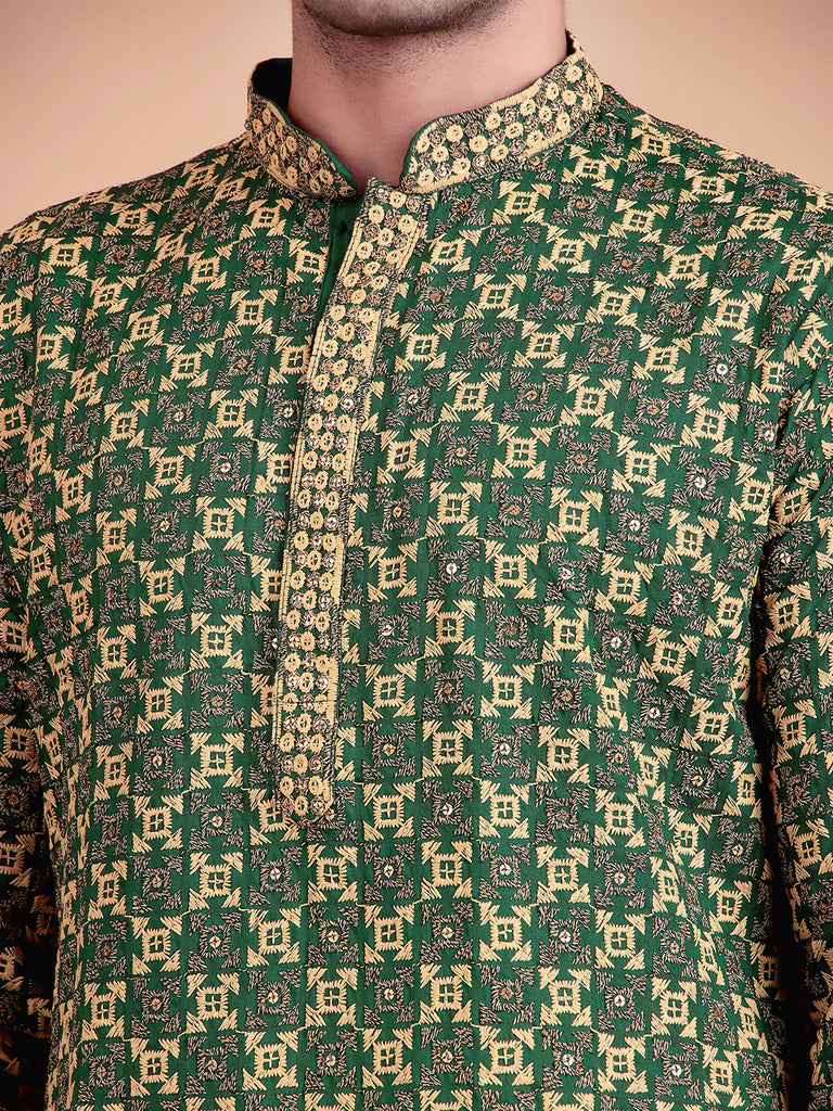 Regal Green & Yellow Thread Embroidered Kurta with White Pajama for Festive Wear
