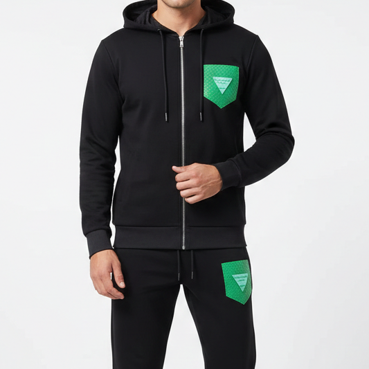 Black Premium Tracksuit with Green Textured Pocket Accents