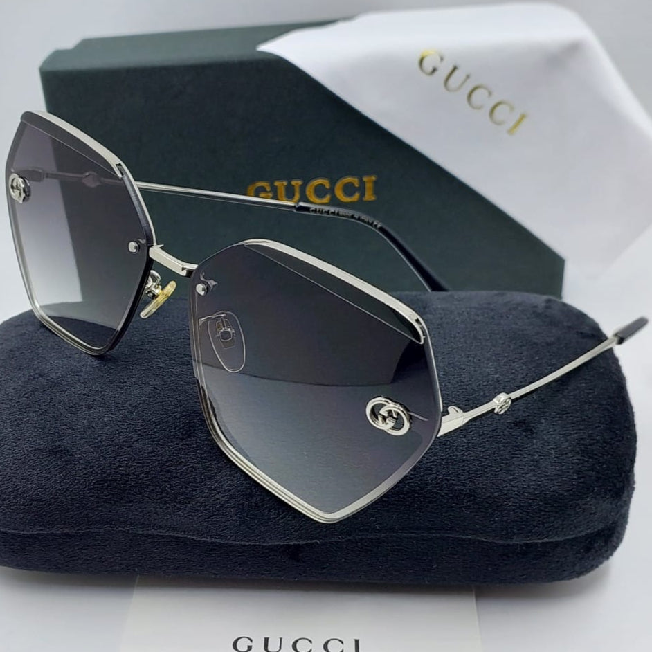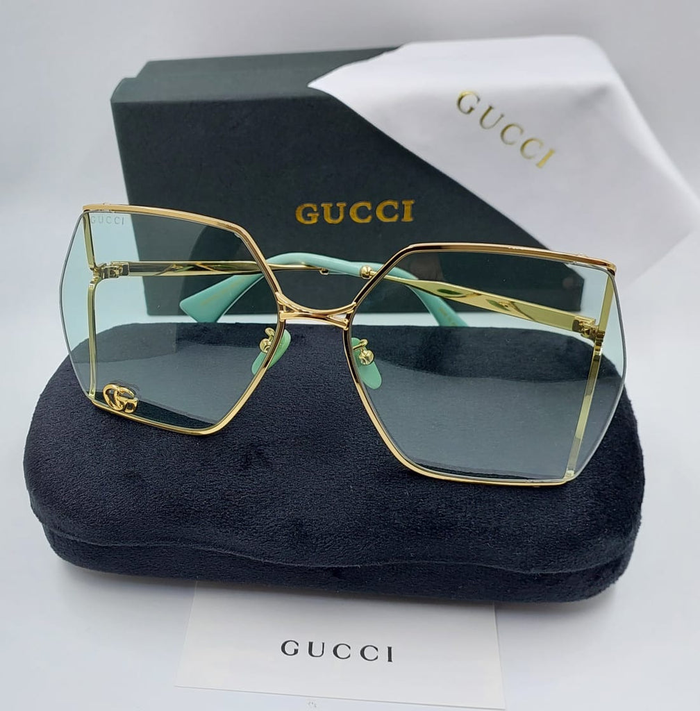 - Bold oversized geometric frames available in gold with green gradient lenses and silver with grey gradient lenses