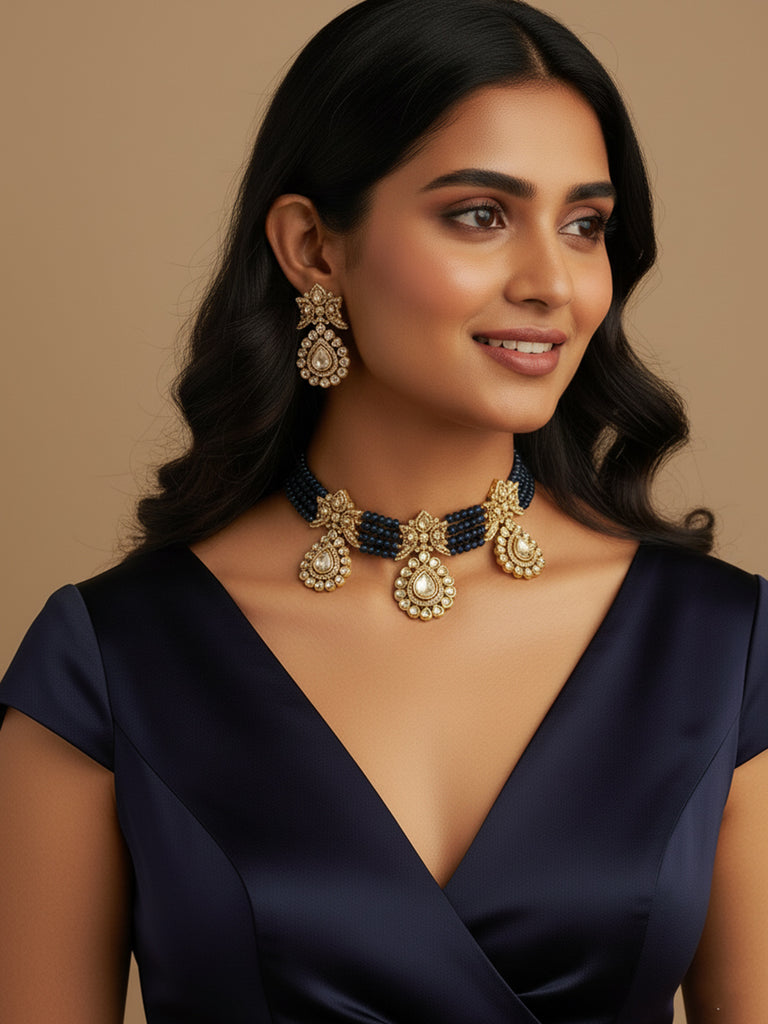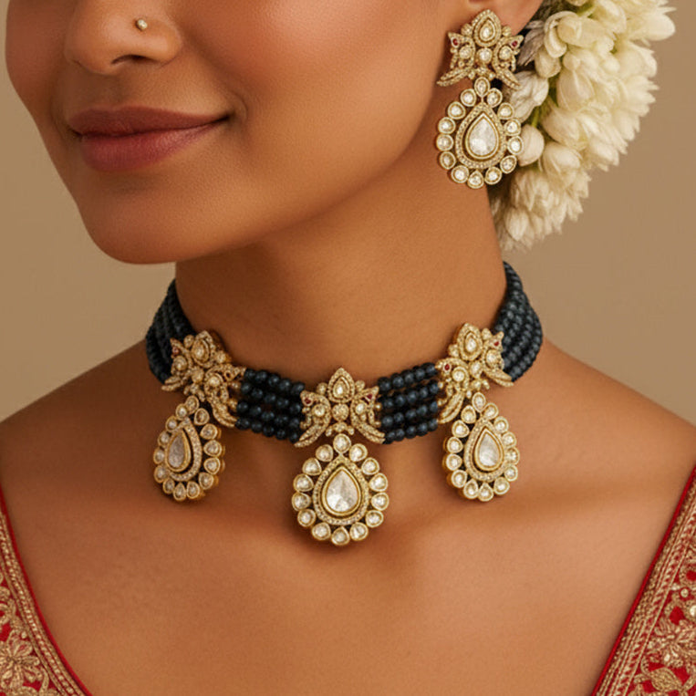 Elegant Onyx Beaded Victorian Necklace Set with Moissanite Polki CZ