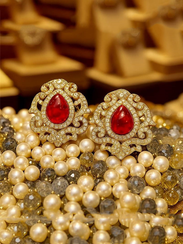 - The set includes matching earrings with the same red teardrop stones and sparkling border.