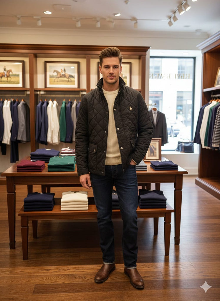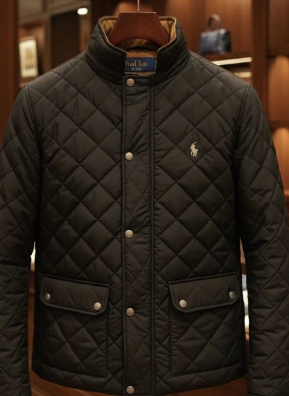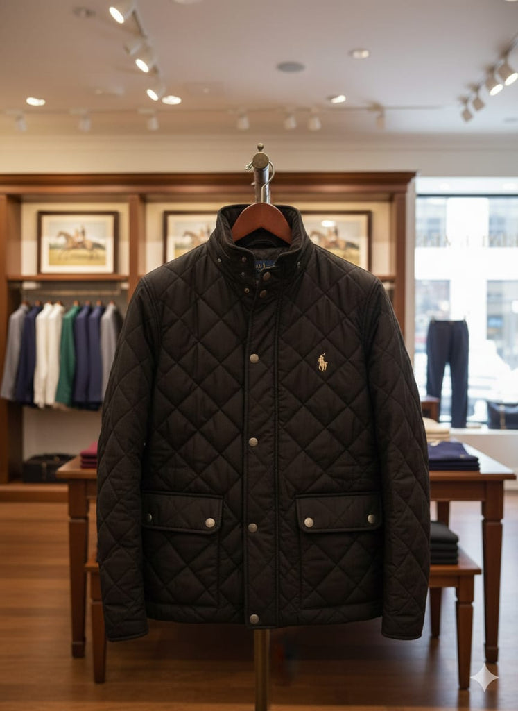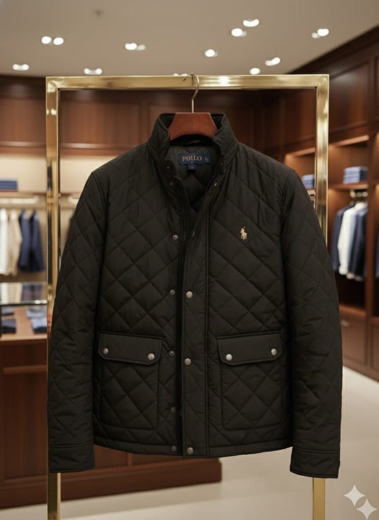 Men’s Classic Black Quilted Winter Jacket with Stand Collar