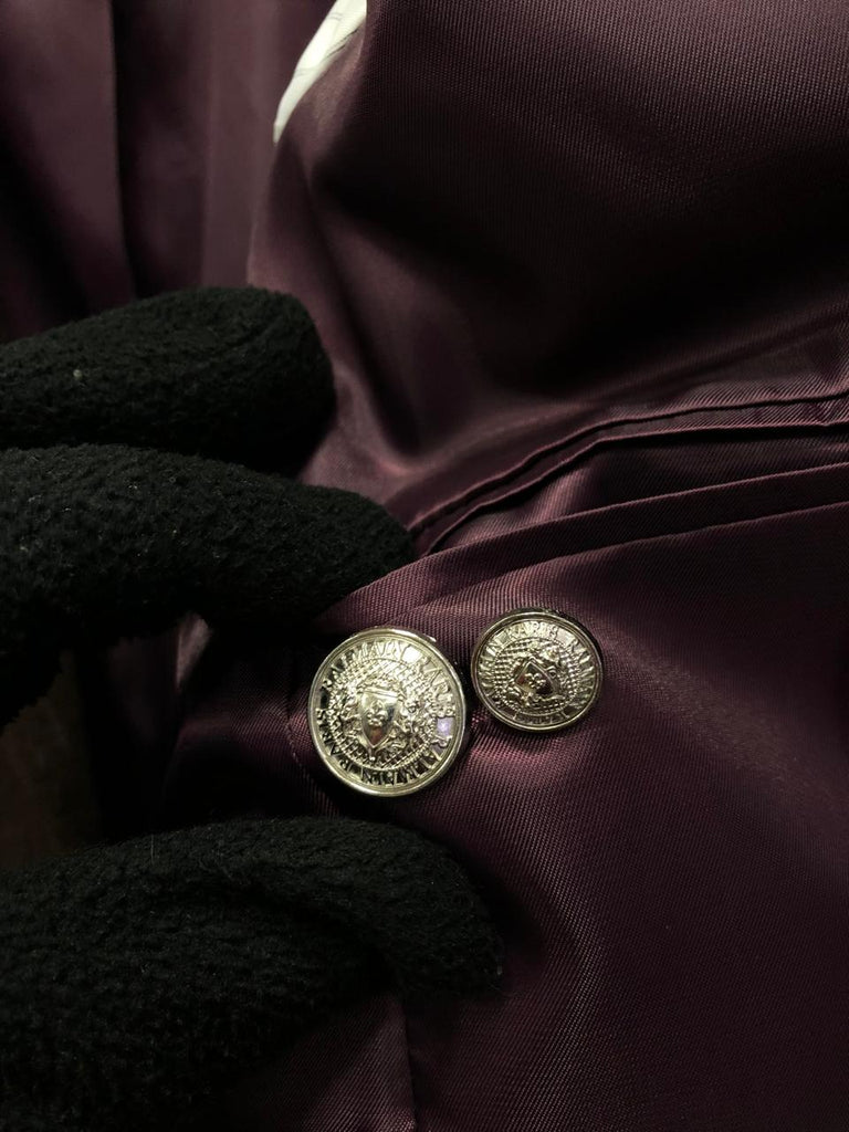 • Double-breasted style detailing with brand signature silver metal buttons, known for the brand’s iconic military-inspired look.
