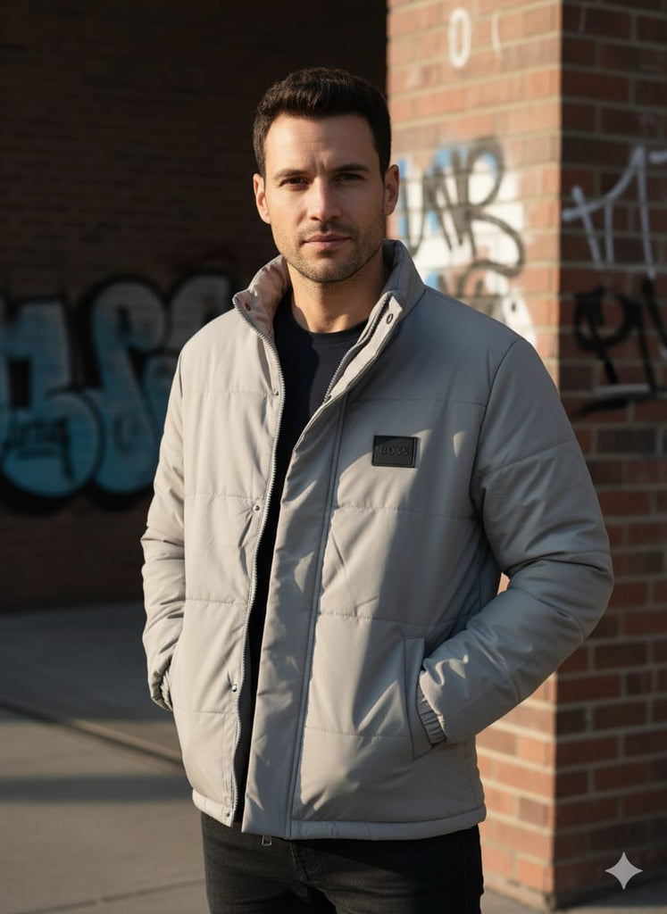 - Design: Sleek and modern with a subtle quilted pattern. Features a high collar and snap button closure for added warmth and style.