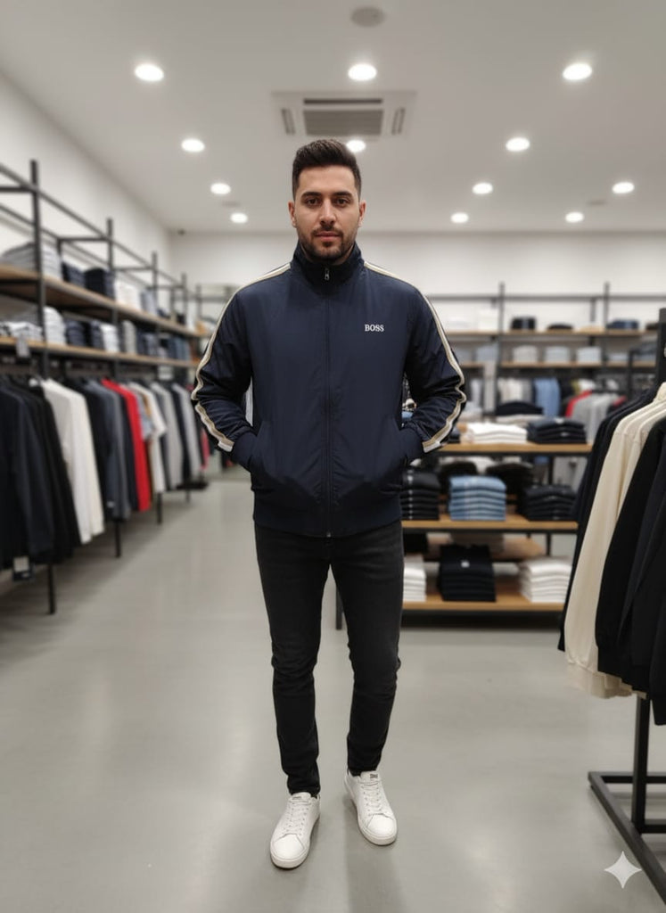 Luxury Navy Track Jacket with Contrast Stripe Details
