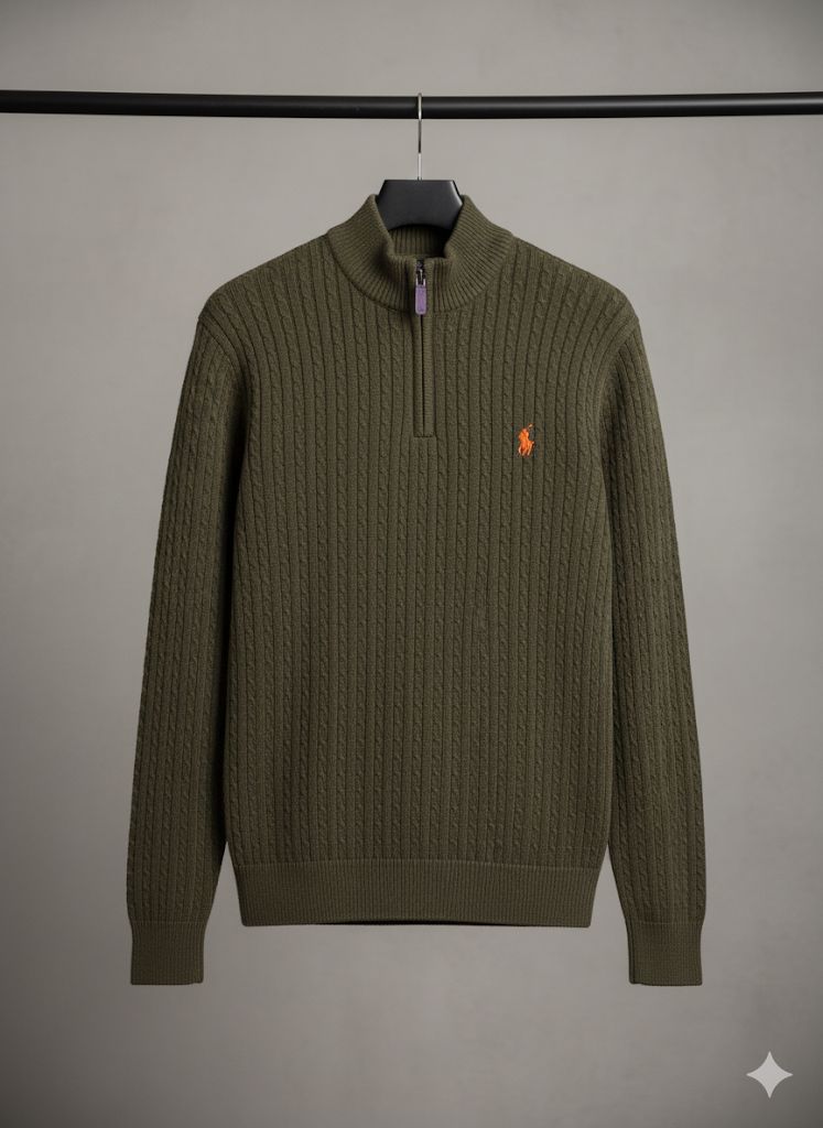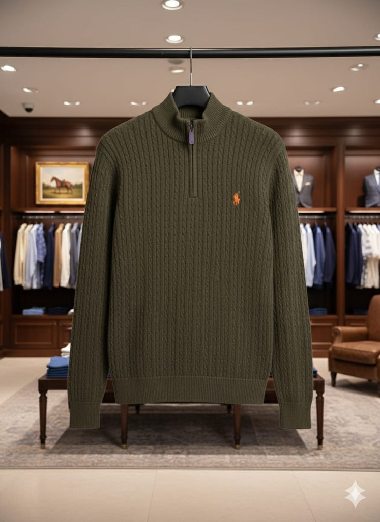 - Rib-knit mockneck. Quarter-zip placket. Custom-developed suede zip pull with a "Polo" logo.