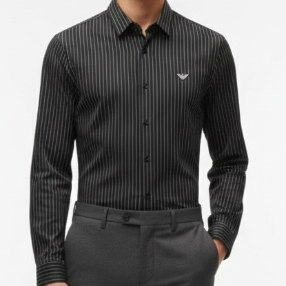 Men’s Black Striped Formal Shirt with Premium Logo Detail