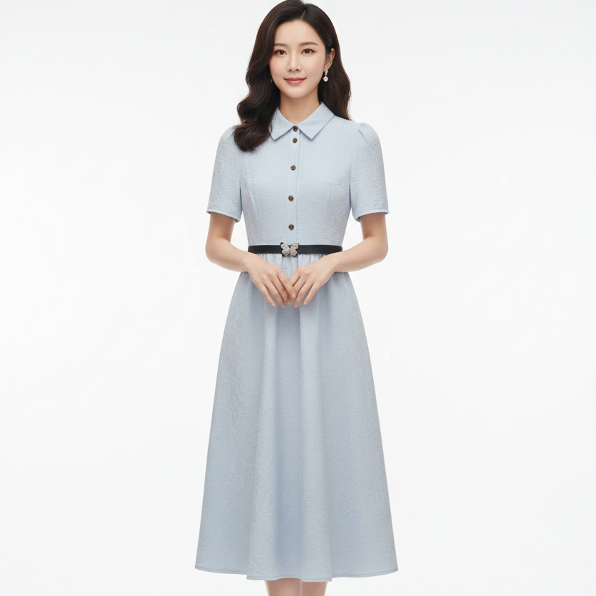 Premium Collared Short Sleeve Fit & Flare Midi Dress with Waist Belt