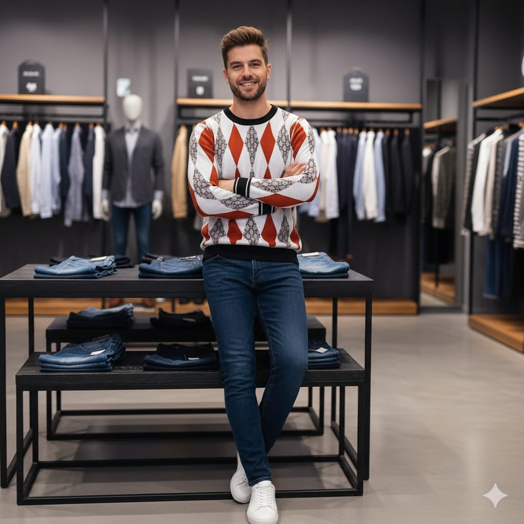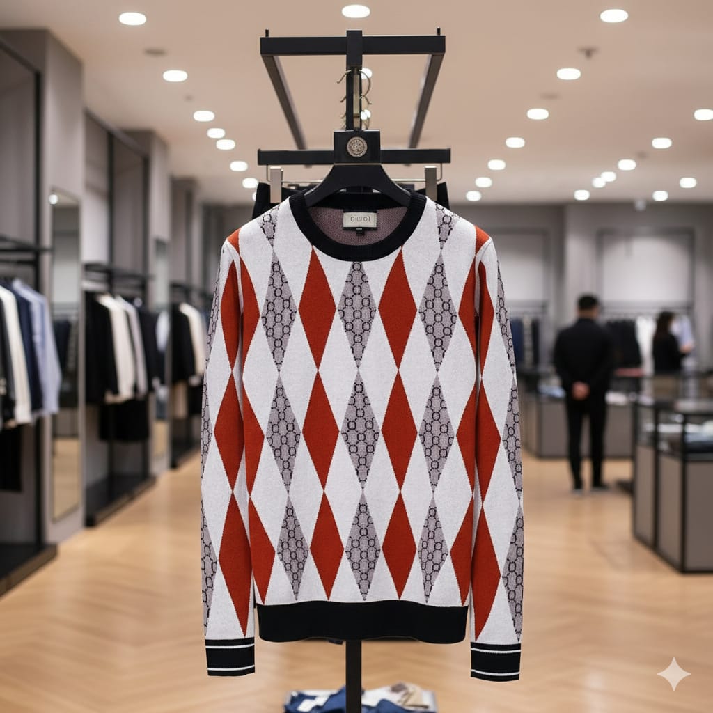 - Large red, white, and grey diamond shapes that look stylish and eye-catching.